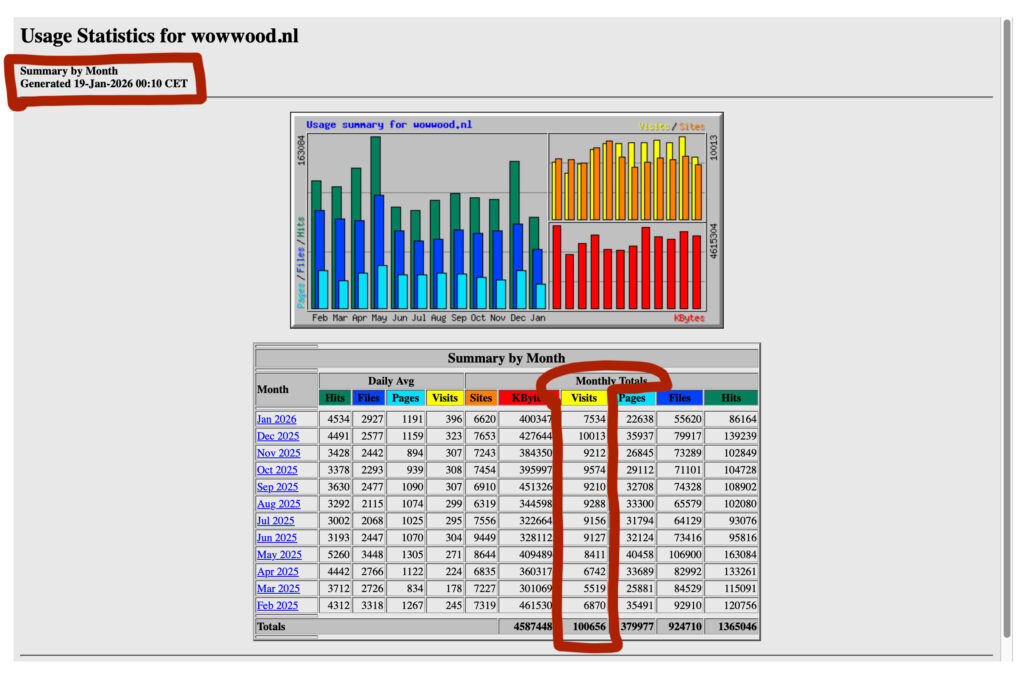 Statistiek van 19 januari 2026: binnen een jaar 100.656 bezoekers. Nu bijna 400 per dag, een sterk stijgend aantal.